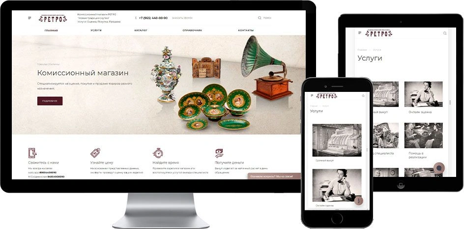 Задачи: Клиент обратился в нашу компанию с просьбой создать сайт антикварной лавки и комиссионного магазина 2 в 1, разработать индивидуальный дизайн, проработать и наполнить главную страницу и страниц услуг для возможности дальнейшего продвижения ресурса в поисковых системах.